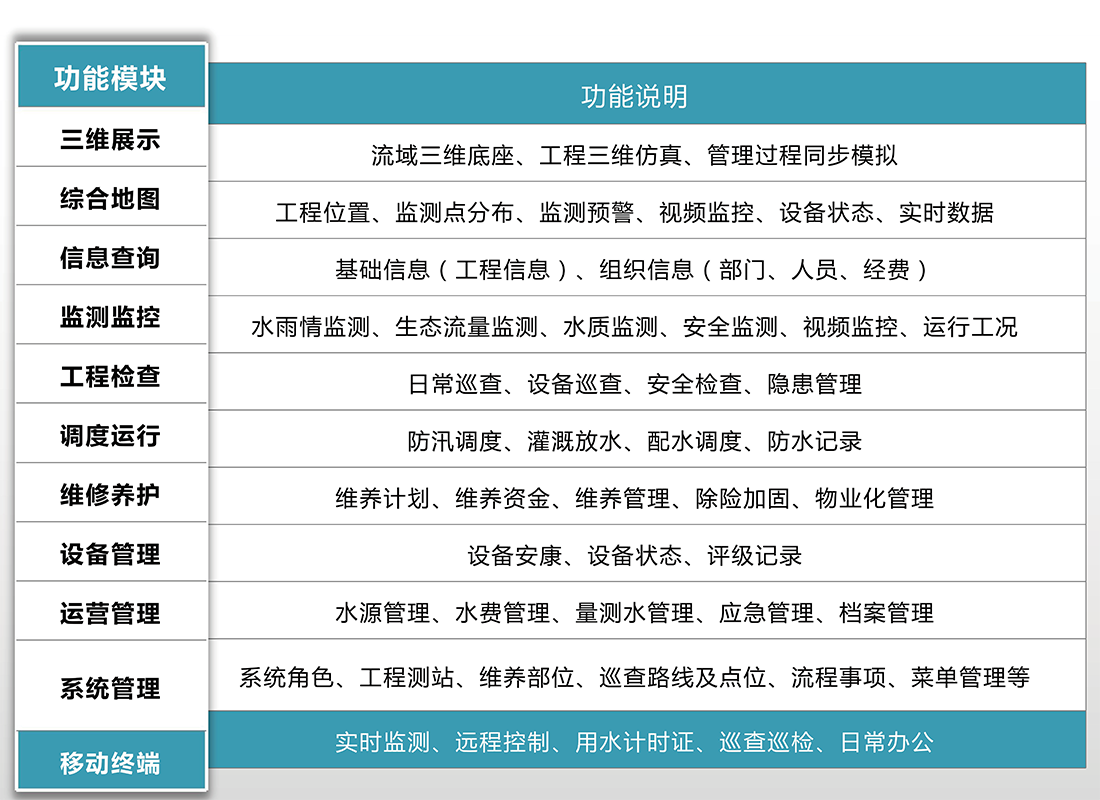 系統(tǒng)依托PLC、IOT等數(shù)字化技術,從PLC到信息化實現(xiàn)全鏈路解決方案,實現(xiàn)水利工程信息化集成、信息化運營。轉(zhuǎn)變水庫、水閘、泵站、堤防、山塘、灌區(qū)、水站、供水廠等水利工程日常管理模式,覆蓋工程狀況、安全管理、運行管護、管理保障和信息化建設等5大建設需求。
