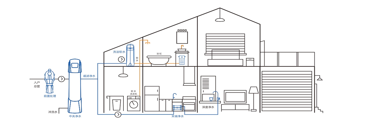 全屋凈水系統(tǒng)是從水源入戶開(kāi)始,根據(jù)家庭不同用水點(diǎn)需求,通過(guò)不同凈水產(chǎn)品科學(xué)合理搭配,將家庭飲水、廚房用水、洗漱、沐浴及洗衣等生活飲用水進(jìn)行全方位深度凈化,以全面深度保護(hù)家人身體健康及熱水器、洗衣機(jī)、浴缸、淋浴器、智能馬桶等家用涉水設(shè)備。全屋凈水系統(tǒng)一般由前置處理產(chǎn)品、中央凈水產(chǎn)品、軟水產(chǎn)品、末端凈水產(chǎn)品組成。